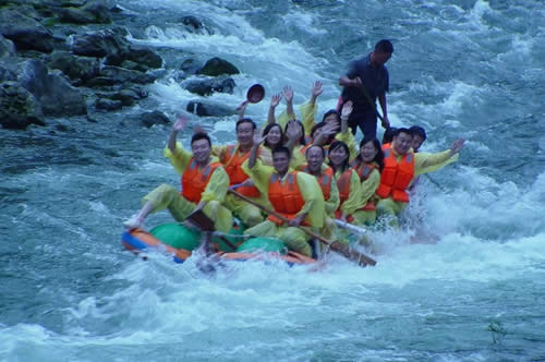 | 猛洞河玩水,素來是被人視著同與之比鄰的張家界游山一樣愜意的事。精彩絕倫的則莫過于從哈尼宮到牛路河約17公里長的一段漂流了。著名社會學家費孝通費贊之為“天下第一漂”,中國國際旅行社總社評它為國內僅有的兩條四星級漂流線路之一。甫到起點,水在山灣打著旋平緩回流,不時伸出幾朵浪花。溫存地舔一舔斜斜漫到河床里來的山腳,你不覺得如何,也許懷疑莫非人家誆你?可是漂流舟劃出不幾分鐘,你的心就要一點一點收攏著提起來。山峰開始相峙著逼近,天空在頭頂漸漸變窄,濃綠的樹蔭越來越密匝,水流越來越湍急,亂石嶙峋,險灘叢生,你跨下的輕舟,不知幾時,從一張休閑的搖椅,變成一匹奔騰的烈馬了,竄高躍低,左沖右突,由不得你不發(fā)出陣陣大呼小叫!