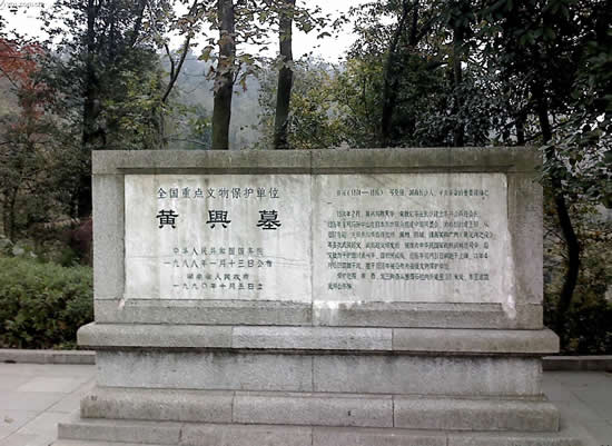 在岳麓山上。墓由三層臺階百余級踏步導(dǎo)入,墓碑為一四棱形的整塊4乳白色巖石琢成,全高約10米,因地處岳麓山高峰開闊處,顯得格外聳拔、挺秀、眺望湘江江,長沙景物盡入眼底。黃光(1874—1916),朱名軫,號杞園,又號克強,湖南善化(今長沙)人,辛亥革命重要領(lǐng)導(dǎo)人,史有“孫黃”之稱。1904年組織華興會,翌年8月與孫中山、章太炎等人組織中國同盟會,曾生動并領(lǐng)導(dǎo)欽州、廉州(治今廣西合浦)、鎮(zhèn)獻(xiàn)花(今友誼關(guān))、河口、廣州等地區(qū)反清戰(zhàn)役起義,任民軍戰(zhàn)時總司令。南京臨時政府成立,任陸軍總長。袁世凱稱帝后,任討袁軍總司令。1914年赴美醫(yī)病,1916年病重回國,10月31日于上海病故,時年43歲,次年移柩長沙,國葬于岳麓山。為全國重點文物保護(hù)單位。
