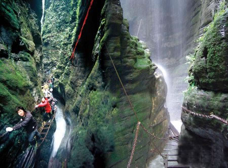 坐龍峽風(fēng)景區(qū) 坐龍峽擁有中國第一條特種游道。所有游道均建于峽谷深處,依山取勢,既經(jīng)細(xì)心雕琢聽卻又渾然天成。粗樸的板栗木棧道,可以讓你零距離的親近那一潭碧幽、聽聞山泉叮咚;精巧的跳墩,可以讓你媳戲流泉、觸感溪瀑;原質(zhì)的石坎道,讓你不得不調(diào)動(dòng)全部的身心能量悉心攀援、感悟峽谷;有驚無險(xiǎn)的鐵梯,讓你伴著腳下轟鳴的溪水,在驚怵中體味一份快慰。出口處的土家山寨,保留了古樸獨(dú)特的生活習(xí)俗。一塊臘肉就一口醇香的“苞谷燒”會(huì)讓你洗去所有的疲憊,在輕松中憨厚的主人向你講述過去強(qiáng)人出沒的故事......