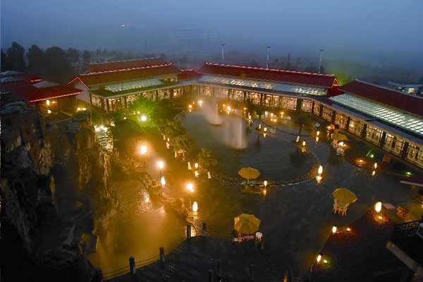 江埡溫泉主要硬件特色是高標(biāo)準(zhǔn)的自然園林式露天溫泉與室內(nèi)溫泉,建有同心池、六福湯、瀑布溫泉、石板溫泉、椰奶溫泉、花草溫泉、咖啡溫泉、紅酒溫泉等,布局體現(xiàn)出鄉(xiāng)土格調(diào),鵝卵石、青石板鋪地, 假山瀑布,小橋流水,20余種各賦特色、各具功能的溫泉池鑲嵌其中, 一派恬淡寧?kù)o的詩(shī)情畫意。