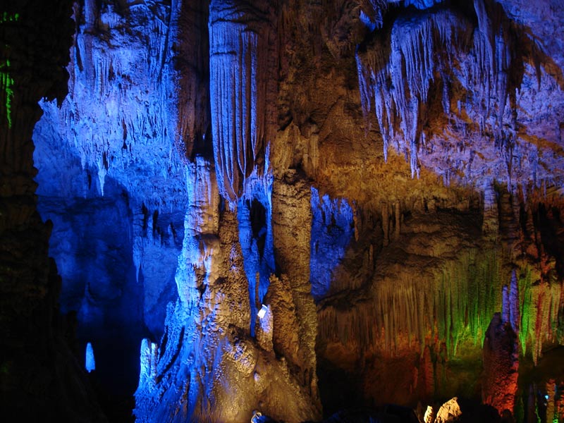 桑植縣九天洞 九天洞總面積達(dá)250多萬平方米,分上、中、下三層,最底層于地表420米。洞內(nèi)有40個大廳、3條陰河、12條瀑布、5座自生橋、6處千丘田、3個自然湖。洞中石筍、石柱林立,石簾、石幔遍布。堆珍疊玉、千姿百態(tài)。九天洞被譽為中國溶洞奇葩。