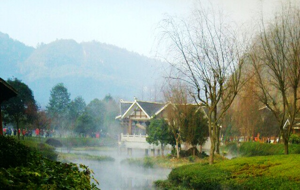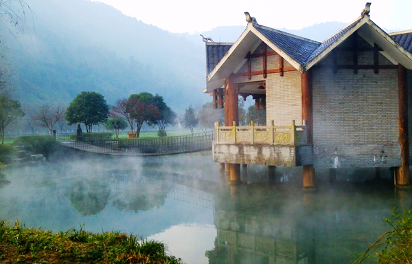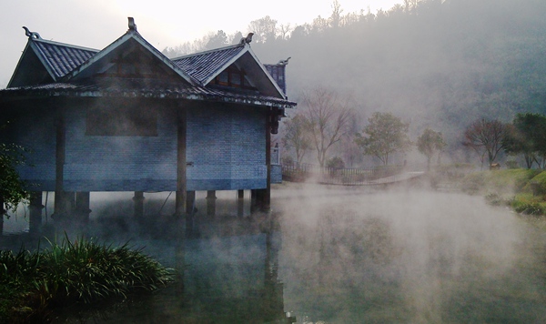 “泉源沸涌,浩氣云浮。”據(jù)了解,黃龍洞生態(tài)廣場的水源出自于洞內(nèi)的地下河,水溫常年保持在16攝氏度左右。當(dāng)從洞內(nèi)流淌出來的溫暖水流與洞外的低溫空氣相遇之后,頓時形成沸騰的水汽,從而形成“浩氣”景觀。