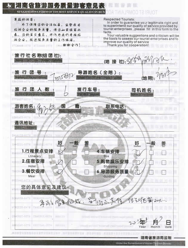 8月初,山西太原孟先生一行6位貴賓與湖南西部(張家界)中國國際旅行社工作人員——小吳取得聯(lián)系,經(jīng)過商談,雙方達成協(xié)議并簽訂旅游合同,于8月14日抵達張家界,開始張家界之旅。此次行程是由我社優(yōu)秀導游——褚偉負責旅游接待工作,褚導在旅游過程中講解詳細,客人也很滿意,在意見表上寫道:導游服務挺好,謝謝周先生。同時也感謝周先生選擇湖南西部(張家界)中國國際旅行社,以及您對湖南西部國旅的信任與支持。我們會繼續(xù)努力,做好旅游接待工作。期待下一次與您的合作,祝您愉快!