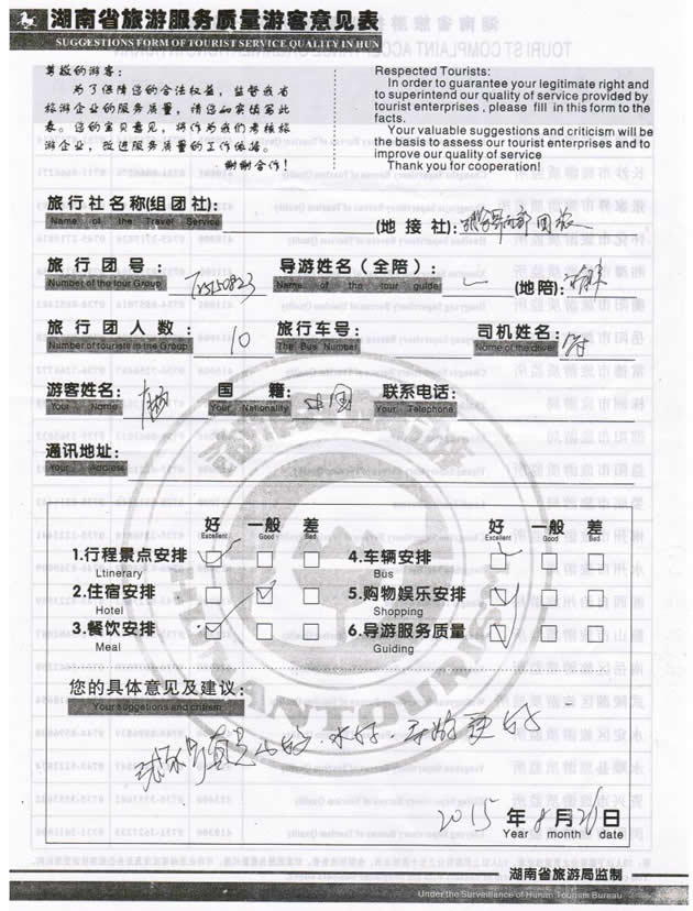 現(xiàn)在位置:首頁 -> 西部國(guó)旅->旅游質(zhì)量反饋 -> 2015-8-23 江蘇肖女士一行10位貴賓 天門山、張家界、天子山、黃龍洞三日游