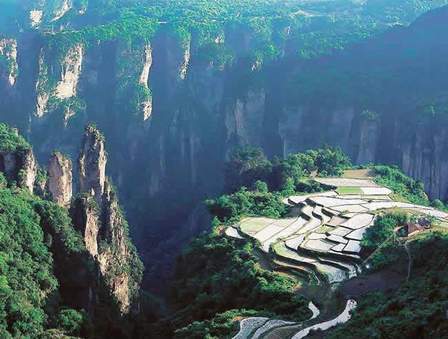 空中田園坐落在天子山莊右側(cè)經(jīng)老虎口、情人路方向兩公里處的土家寨旁,海拔1000余米。它的下面是萬丈深淵的幽空中田園谷,幽谷上有高達(dá)數(shù)百米的懸崖峭壁,峭壁上端是一塊有3公頃大的斜坡梯形良田。田園三方峰巒疊翠,林木參天,白云繚繞,活像一幅氣勢磅礴的山水畫。登上“空中田園”。清風(fēng)拂袖,云霧裹身,如臨仙境,使人有青峰鳴翠鳥,高山響流泉,身在田園里,如上彩云間”之感 。