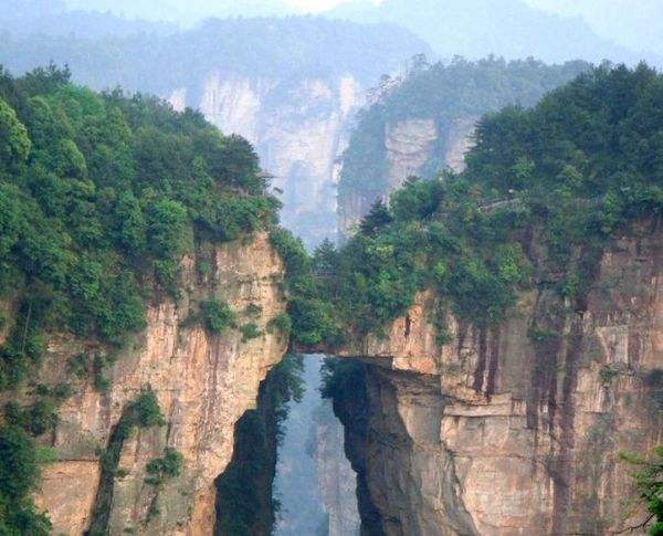 “后花園”至天下第一橋,有一條全長2000多米的游道,路面多為白色的條石鋪成,站在遠(yuǎn)處觀望,很像一條白色的綢帶打了兩個(gè)結(jié),一頭系在“迷魂臺(tái)”,一頭第在“天下第一橋”。信步漫游,沿途可欣賞到“拜仙臺(tái)”、“百丈絕壁”、“小洞天”、“情人谷”等別有情趣的景點(diǎn),這里海拔不高,一般不受氣候影響,慢慢品味,定會(huì)使您賞心悅目!疤煜碌谝粯颉笔菑埣医纭笆蠼^景”之一。也是袁家界的標(biāo)志性景點(diǎn),它是居于兩山之間形成的一座天然石橋,而兩山原為一體,橋身是兩山相連的關(guān)鍵部分,但因中間石質(zhì)較為薄弱,由于風(fēng)化、崩塌作用的影響,又經(jīng)過日曬雨淋、流水洗刷、山洪沖擊,久而久之,終于形成今天這一特別的奇景……。自杉刀溝上袁家界,沿絕壁頂部邊緣遨游,至于中坪“觀橋臺(tái)” 遙望千米之外,只見一天然石橋凌空飛架兩峰之巔,氣勢磅礴,奇?zhèn)ソ^倫,被稱為“天下第一橋”。石橋?qū)拑H3米,厚5米,跨度約50米,相對(duì)高度近400米。天下第一橋與夫妻巖并稱“張家界雙絕”!疤煜碌谝粯颉睒蛎鎸拑擅祝袼拿,跨度為二十多米,高度為三百多米,是世界是迄今為止所發(fā)現(xiàn)落差最高的天然石橋。