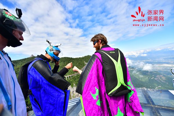 | 2017世界翼裝飛行世錦賽將于9月8日-10日在張家界天門山舉辦。開賽在即,9月7日上午,來自全球11個國家的16名翼裝飛行員從海撥1458米的張家界天門山玉壺峰頂一躍而下,在奇峰險壑間進行競速訓練。